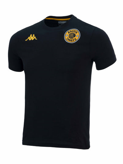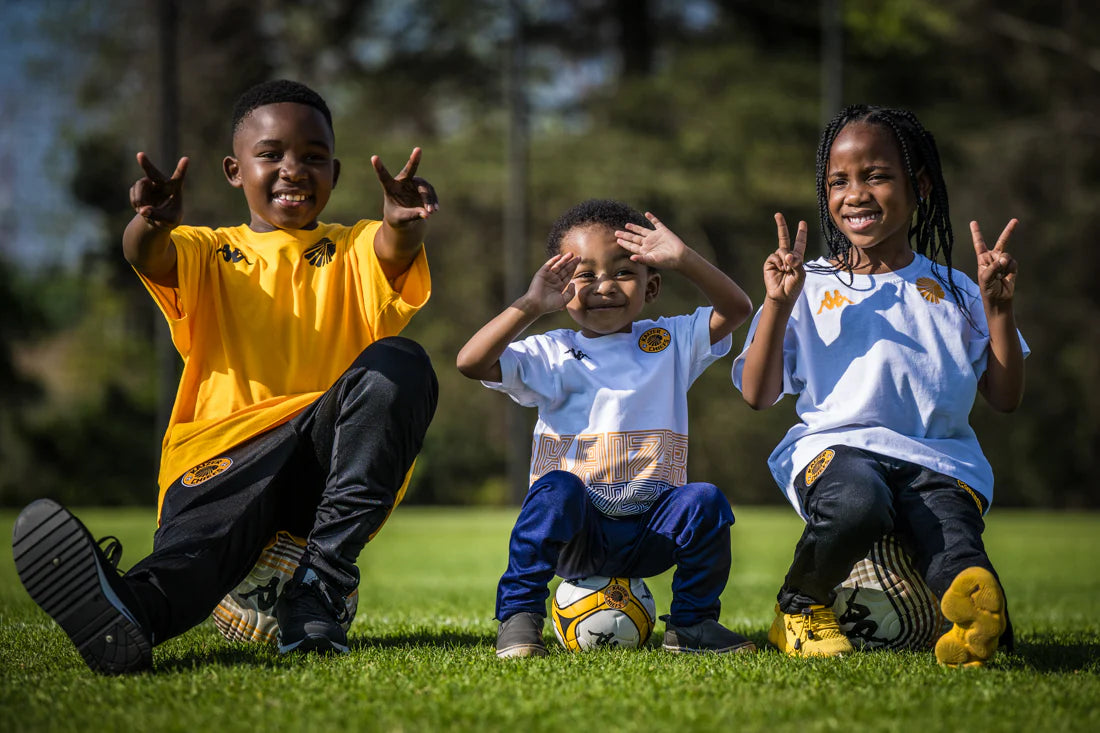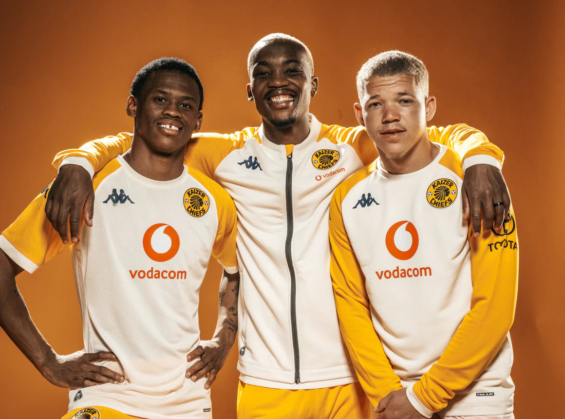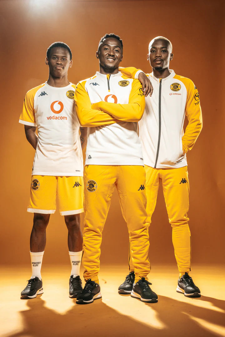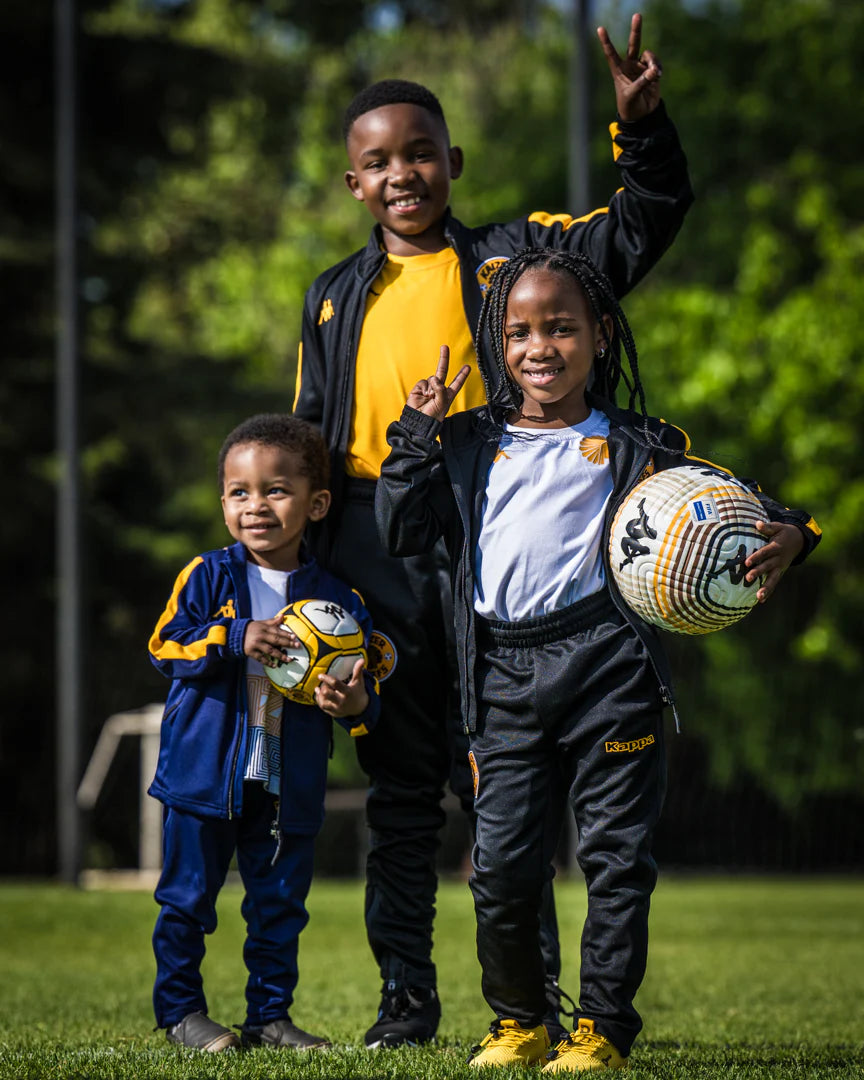 This year’s edition is clean and elevated — a rich, full black finish accented by subtle gold details: the Kaizer Chiefs head and Kappa logo flowing seamlessly from the jacket through to the pants.