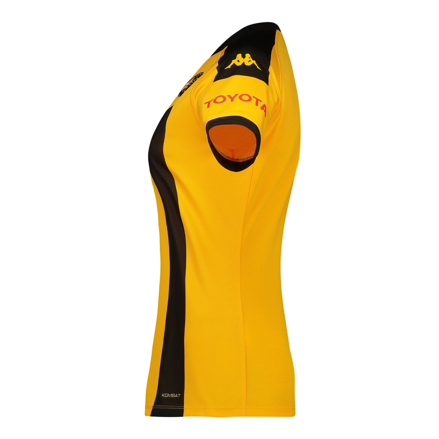 Game shirt KOMBAT™ 2025 for women in recycled interlock fabric and with HYDRO-WAY PROTECTION technology. SLIM FIT. Short sleeve, V-neck in jacquard rib, jacquard fabric on front, on back and on sleeves. Omini logo and sponsor logos on chest and on sleeves applied with heat transfer. Silicon team logo on chest. KAIZER CHIEFS FOOTBALL CLUB.